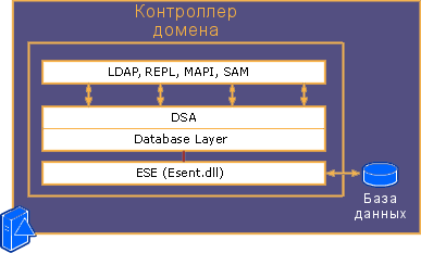 Хранилище AD обрабатывает весь доступ к базе данных. В свою очередь, хранилище данных состоит из физических файлов и служб, которые управляют правами доступа, процессами чтения и записи данных внутри БД на жестком диске каждого контроллера.