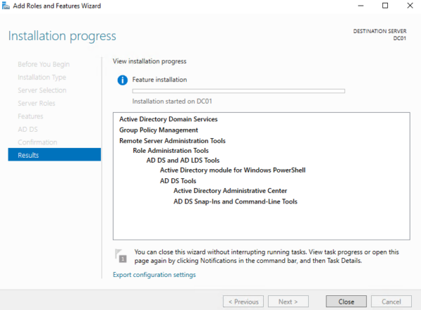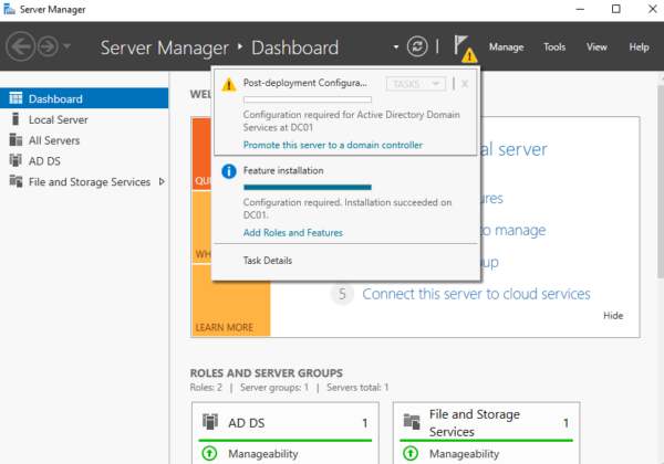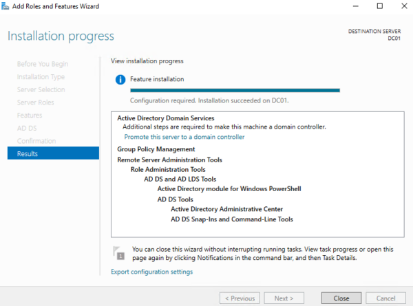 После завершения установки роли, если вы не закроете окно, вам будет предложено повысить сервер до контроллера домена (DC). Ссылка будет выделена синим текстом.