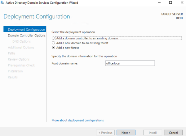 В разделе «Конфигурация развертывания» (Deployment Configuration), включите опцию «Добавить новый лес» “Add a new forest”, а затем введите желаемое имя домена. В моем случае это office.local, и нажмите Next.