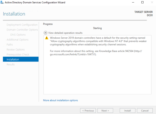 В разделе «Проверка предварительных требований» “Prerequisites Check” будут проверены предварительные условия. Здесь, если возникнет хотя бы одна ошибка, вы не сможете продолжить, и вам нужно будет ее исправить. В противном случае, если отображаются только предупреждающие сообщения (которые являются наиболее распространенными), но проверка прошла успешно, как показано на рисунке, нажмите кнопку Install, чтобы продолжить.