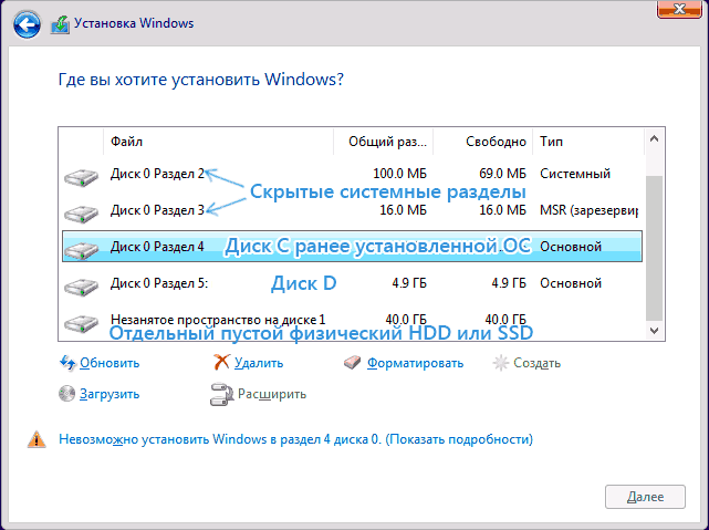 - Оптимальный метод: если на вашем системном диске (Диск 0) нет ничего важного, вы можете полностью удалить все разделы этого диска по одному, выбрать единое незанятое пространство на Диске 0 и нажать кнопку «Далее» это позволит избежать почти любых ошибок и проблем. Создать диск D (если требуется) вы сможете уже после установки системы.